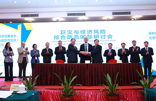 5月13—14日,由北京師范大學(xué)、深圳市前海管理局、達(dá)沃斯全球風(fēng)險(xiǎn)論壇共同主辦,民政部-教育部減災(zāi)與應(yīng)急管理研究院、前海金融控股有限公司、前海再保險(xiǎn)股份有限公司、未來地球綜合風(fēng)險(xiǎn)防范項(xiàng)目共同承辦的“巨災(zāi)與經(jīng)濟(jì)風(fēng)險(xiǎn)綜合防范國際研討會(huì)”在深圳成功舉辦。來自全球的百余名頂尖專家學(xué)者齊聚,共議巨災(zāi)與經(jīng)濟(jì)風(fēng)險(xiǎn)綜合防范。研討會(huì)上,三家主辦單位共同發(fā)布了《巨災(zāi)與經(jīng)濟(jì)風(fēng)險(xiǎn)綜合防范的前海共識(shí)》,并簽署戰(zhàn)略合作框架協(xié)議,約定每隔一年共同主辦一次全球性綜合風(fēng)險(xiǎn)防范會(huì)議。